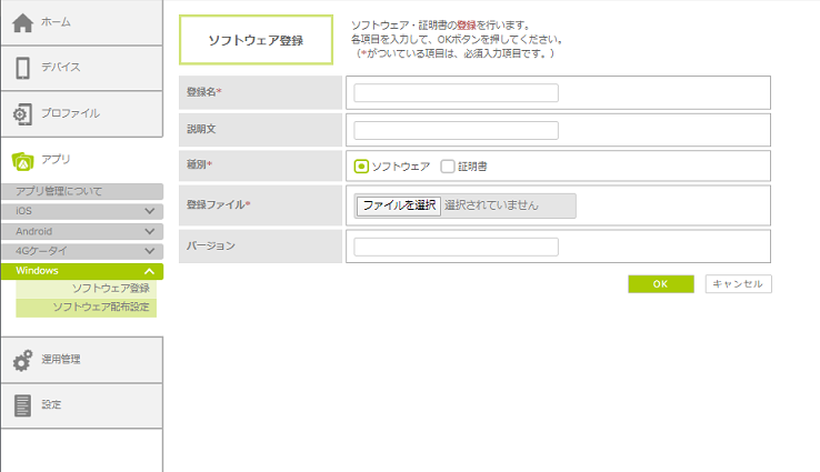 ファイル指定でソフトウェアや証明書を配布する場合、配布するソフトウェアや証明書を事前に管理サイトに登録します。