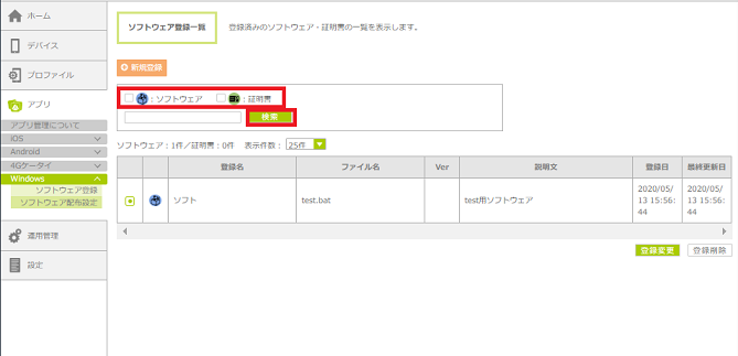 「ソフトウェア登録一覧」画面で「ソフトウェア」または「証明書」にチェックを入れ、「検索」ボタンをクリックすると、種別の検索結果が表示されます。