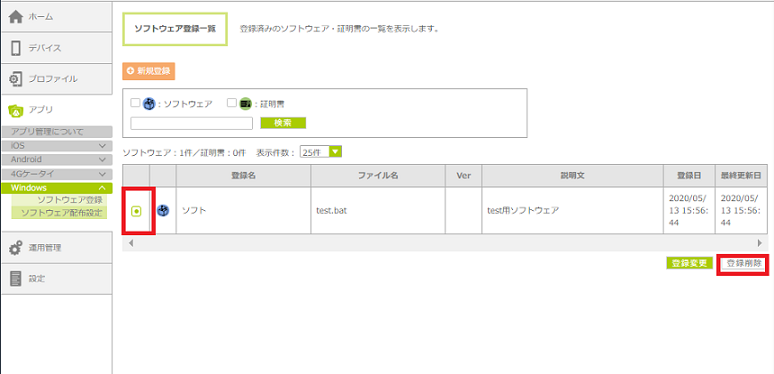 「ソフトウェア登録一覧」画面で削除したいソフトウェアや証明書を選択し、「登録削除」ボタンをクリックします。確認画面で内容を確認し、「OK」ボタンをクリックすると、ソフトウェアや証明書が削除されます。