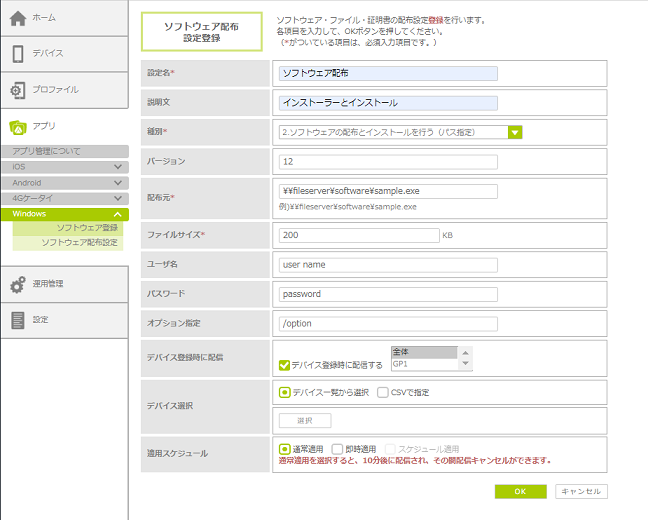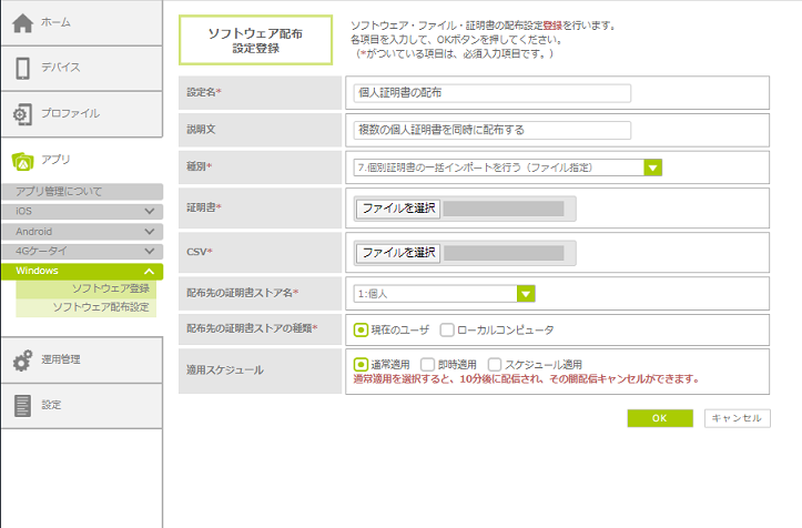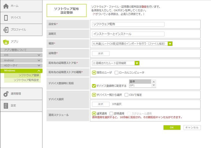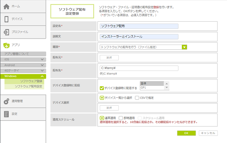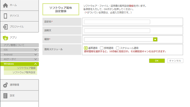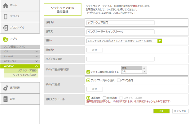 ・MDM登録時に、自動でソフトウェアを配布する設定にした場合、「スケジュール適用」は利用できません。「通常適用」または「即時適用」を選択してください。 |