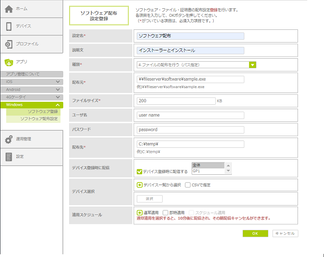 ここでは、ソフトウェア/ファイル/フォルダ/証明書の配布方法や配布・インストール方法を設定し、デバイスに配布する方法を説明します。