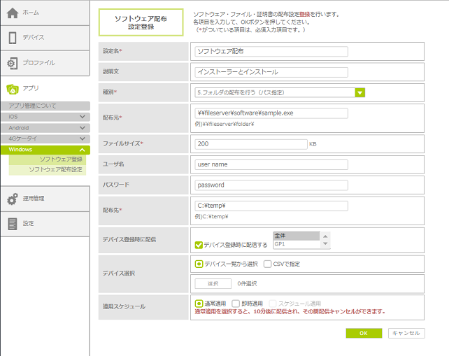 自社内のサーバなどに保存されているソフトウェアやファイルのパスを指定して、デバイスに配布する場合に選択します。配布先には、デバイスのドライブ名とフォルダ名を指定します。