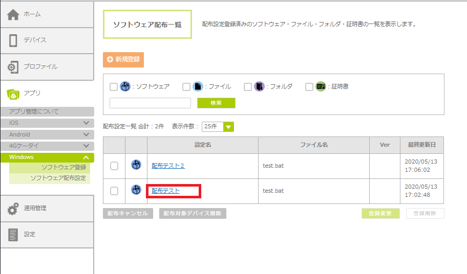 「ソフトウェア配布一覧」画面が表示され、登録したソフトウェア配布設定が一覧表示されます。