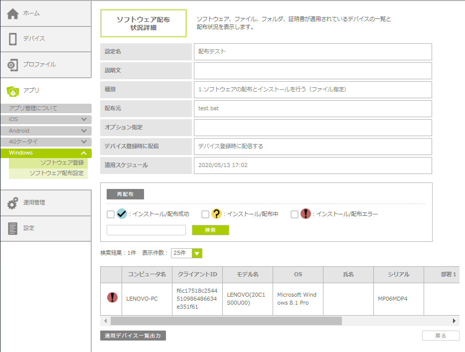 | 「インストール/配布エラー」のステータスになっているデバイスに対しては、再配布を行うことができます。 |