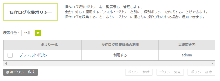 2. 操作ログ収集ポリシー画面の個別ポリシー作成ボタンをクリックします。