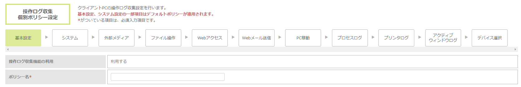 3. 操作ログ収集個別ポリシー設定画面が表示されますので、ポリシー名を入力した後、各ログについて設定を行います。設定項目よってはデフォルトポリシーの設定値から変更できない項目があります。