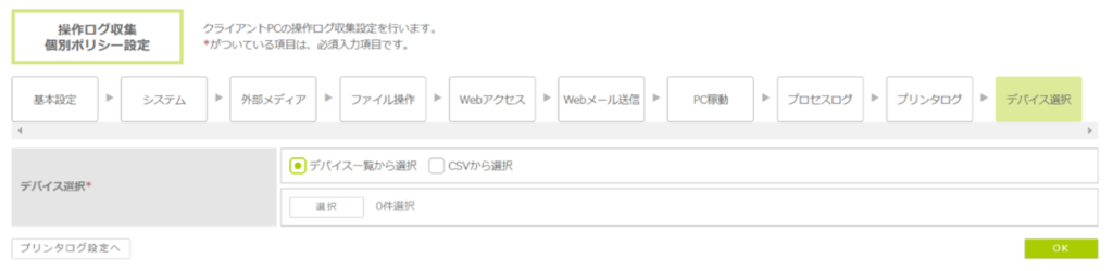 4. アクティブウィンドウログの設定が終わると操作ログ収集個別ポリシーを適用するデバイスを選択します。デバイス選択方法はデバイス一覧から選択する方式とcsvから選択する方式があります。最初に選択したデバイス選択方式は次回以降変更できませんのでご注意ください。