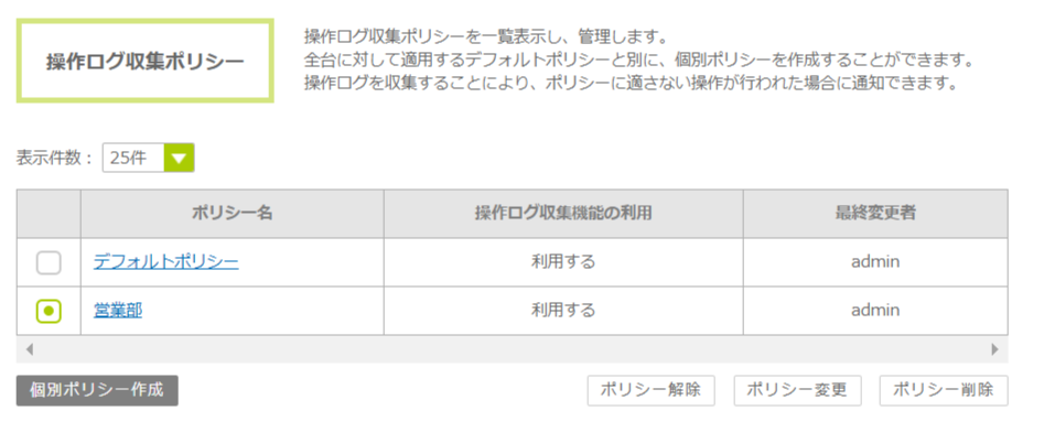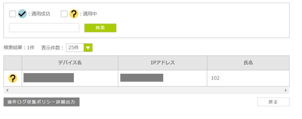 3. 操作ログ収集ポリシー詳細画面が表示されますので、設定したポリシー内容とデバイスの適用状況が確認できます。