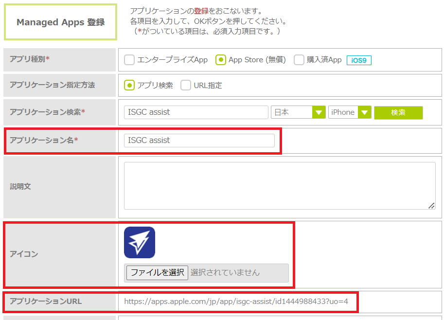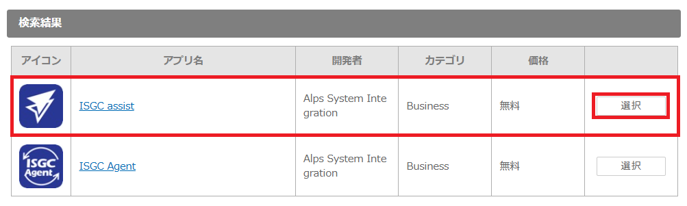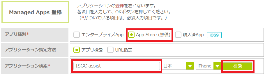 3.「アプリ種別」の「App Store(無償)」にチェックを入れ、「アプリケーション検索」で「ISGC assist」を入力し、「検索」をクリックします。