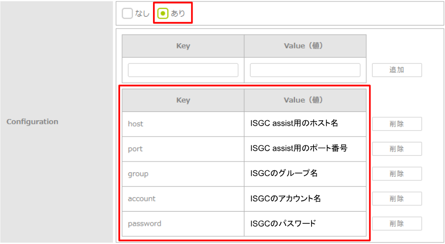 - ISGC assist に設定が必要な情報をBCDMから配布するため、ConfigurationにKeyとValueを設定します。設定が必要なKeyの値は「host」「port」「group」「account」「password」です。