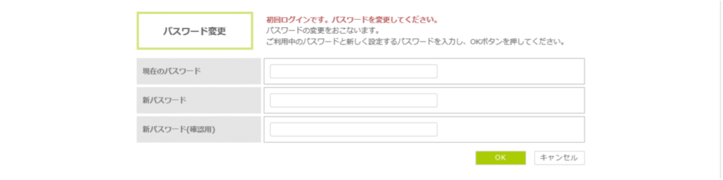初回サインイン時は、「パスワード変更」画面が表示されます。この画面でパスワードの変更を行います。