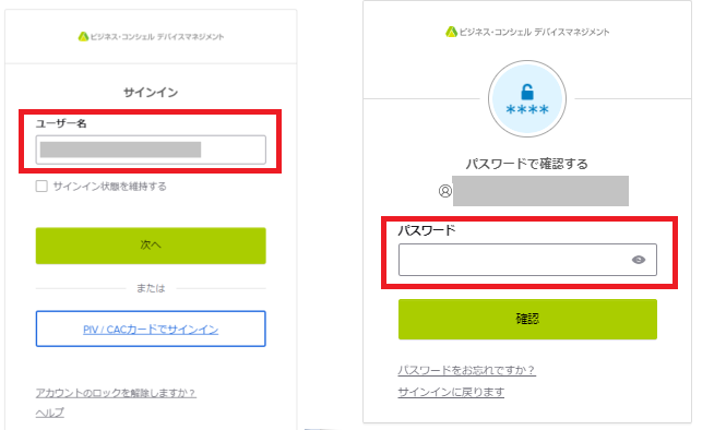 2.「ユーザー名」を入力しクリック後、「パスワード」を入力します。