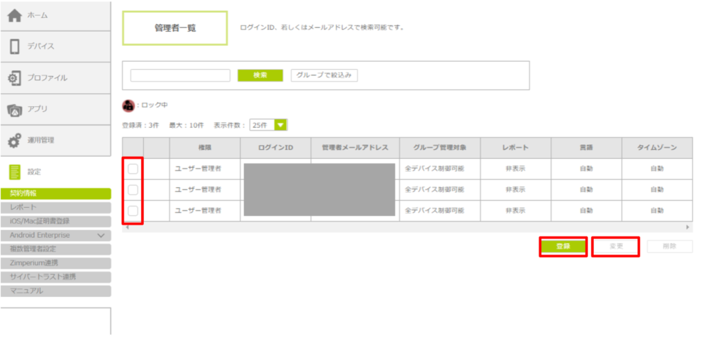 管理者情報を変更したい場合は、管理者を選択し、「変更」ボタンをクリックします。