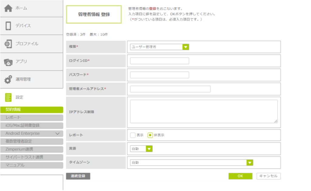 複数の管理者をまとめて追加することもできます。「登録」ボタンをクリックせずに、「連続登録」ボタンをクリックし、各項目を入力します。