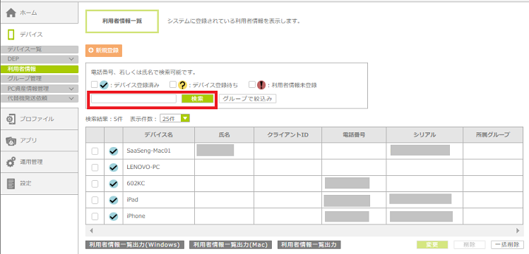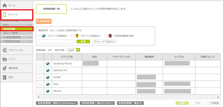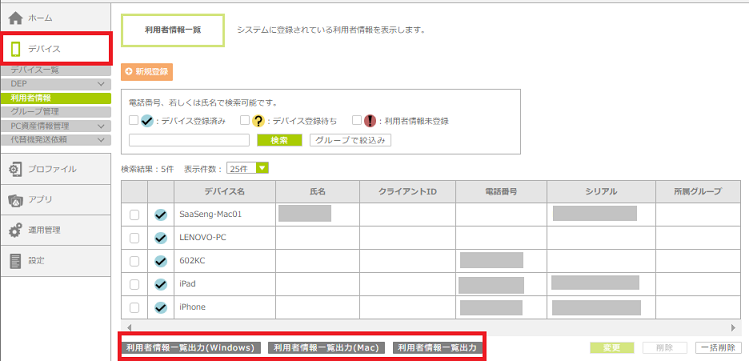 ・登録されていない利用者情報は出力されません。 ・表示条件を指定した状態でCSVファイルを出力した場合は、指定した条件に合う利用者情報のみが出力されます。 ・UUIDやビルド番号は「デバイス一覧」画面から出力するCSVファイルで確認が可能です。 |