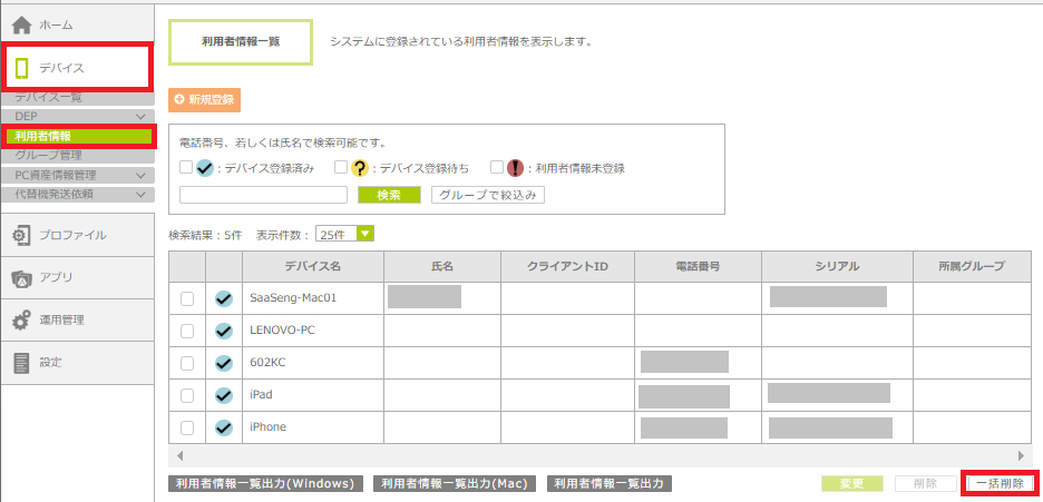 1.「デバイス」をクリックし、「利用者情報」をクリックして、「一括削除」ボタンをクリックします。