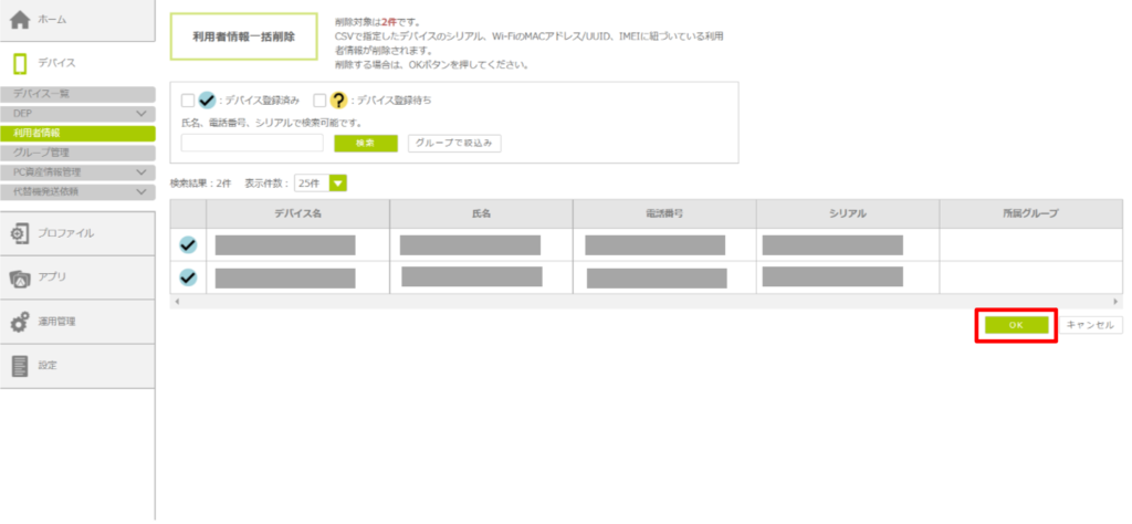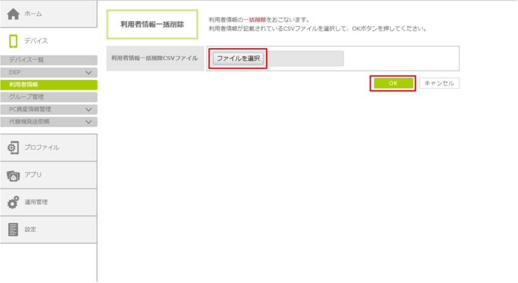 CSVファイルで指定したデバイスに紐づく利用者情報が削除されます。