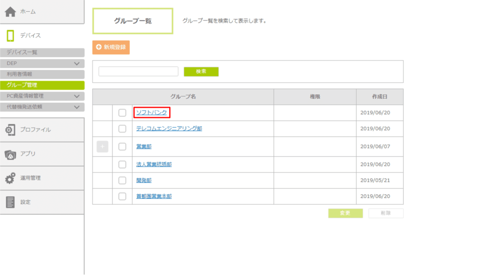 「グループ一覧」画面で、登録したグループを確認、変更、または削除します。
