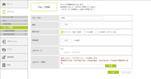 ・グループを変更する場合は、「グループ変更」画面でグループの内容を変更します。