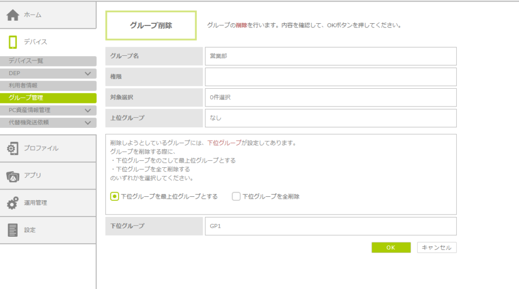 • 削除するグループに下位グループが設定されている場合は、下位グループの処理を「下位グループを最上位グループとする」または「下位グループを全削除」から選択します。