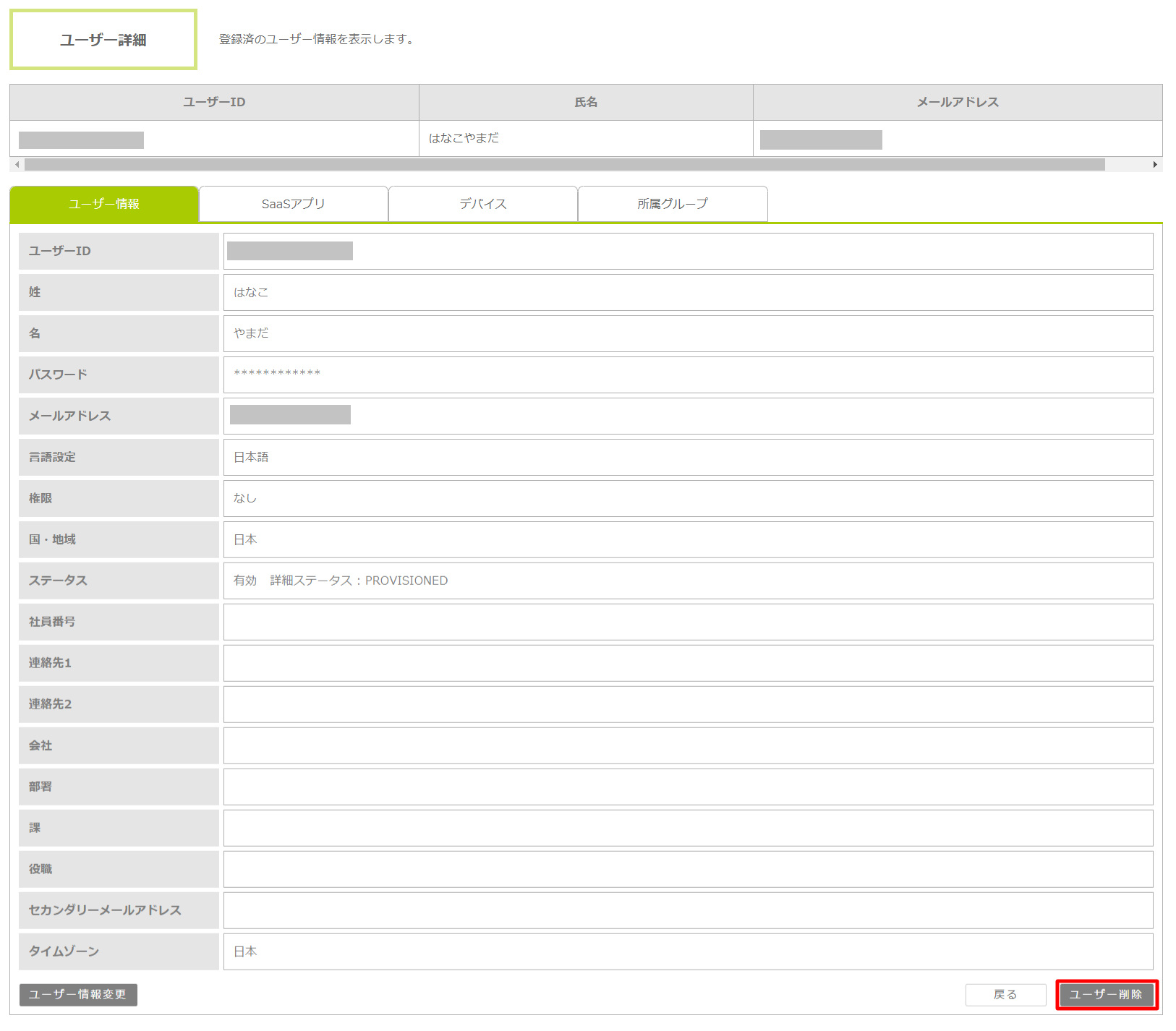 3.「ユーザー情報」タブが開いているのを確認し、画面右下の「ユーザー削除」ボタンをクリックします。