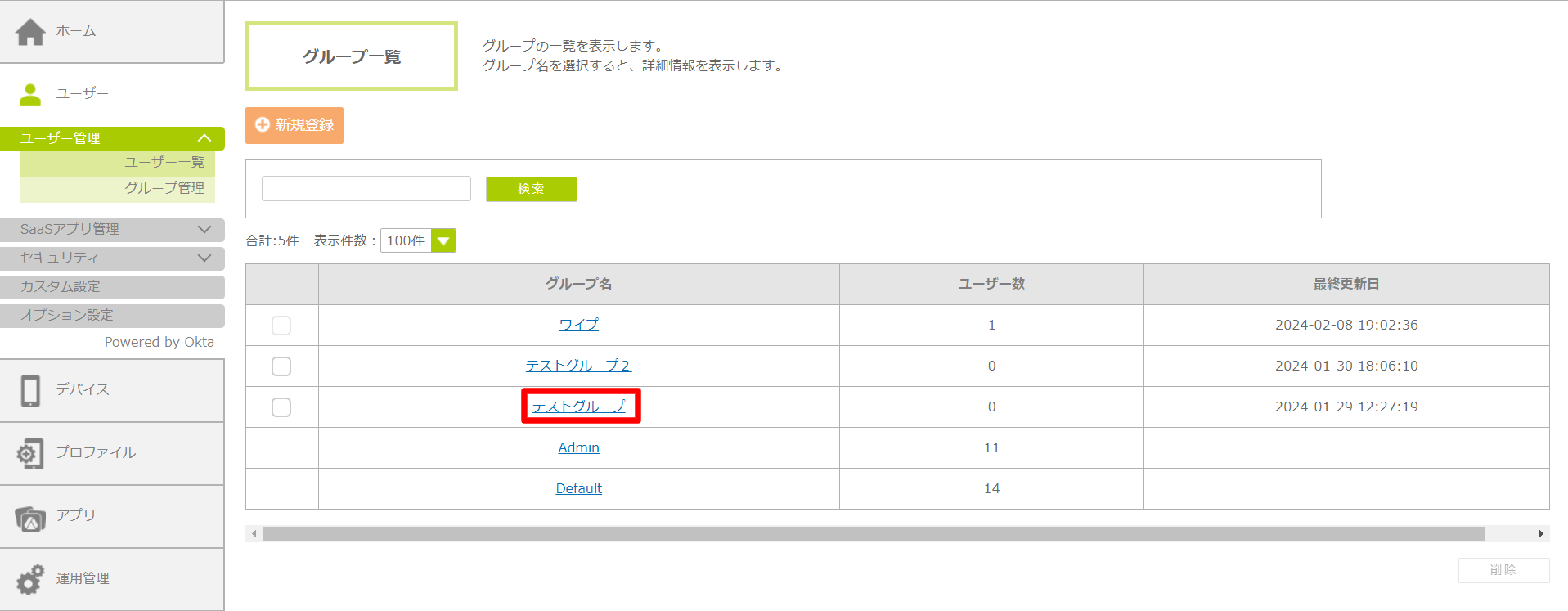 「グループ一覧」画面が表示されます。