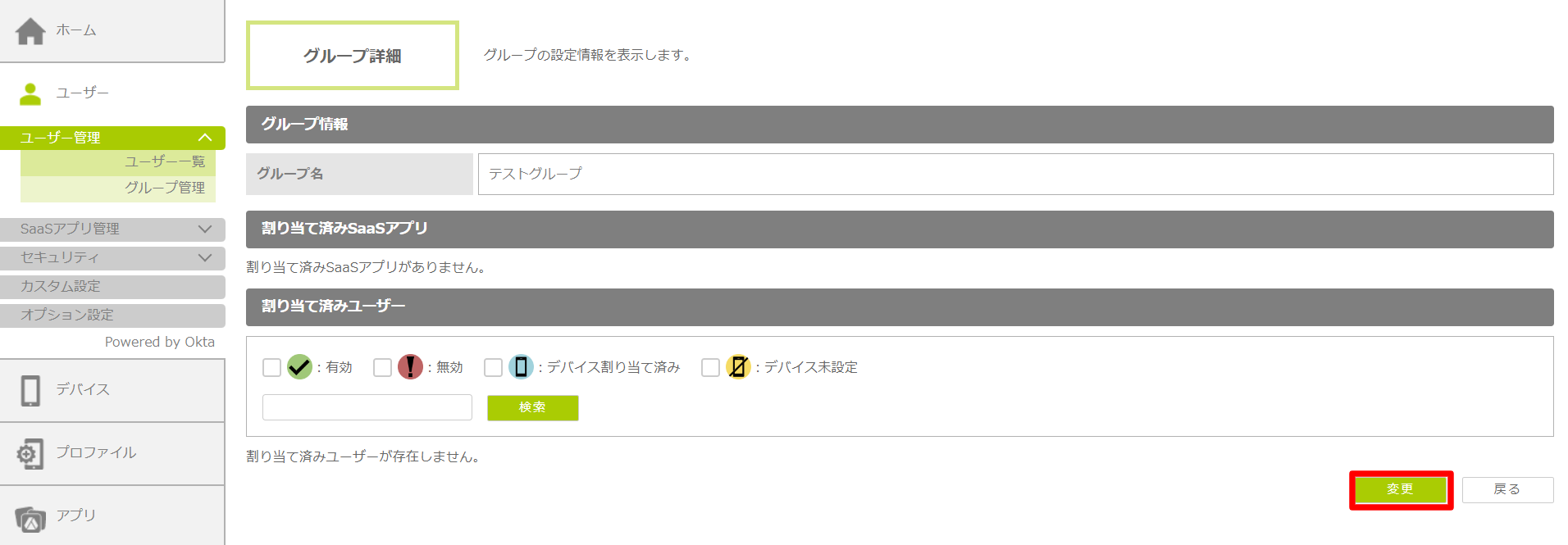 | 割り当て済みSaaSアプリ | ユーザーグループに割り当てられているSaaSアプリの一覧が表示されます。割り当てられているSaaSアプリがない場合は、「割り当て済みSaaSアプリがありません。」と表示されます。 |