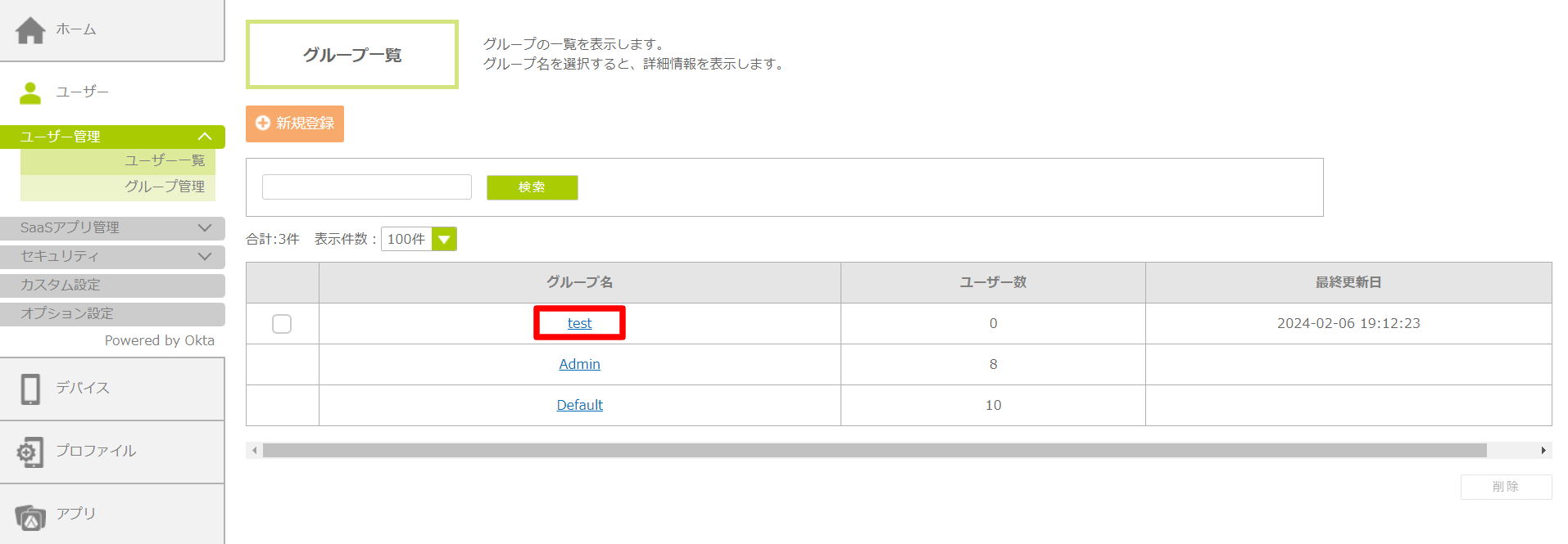 2.「グループ一覧」画面で割り当てられているユーザーを確認したいグループ名をクリックします。