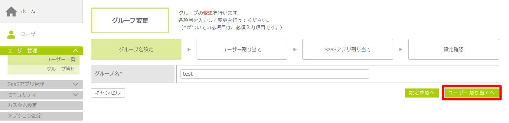 グループ名を変更する場合は、グループ名を変更後、「ユーザー割り当てへ」ボタンをクリックします。