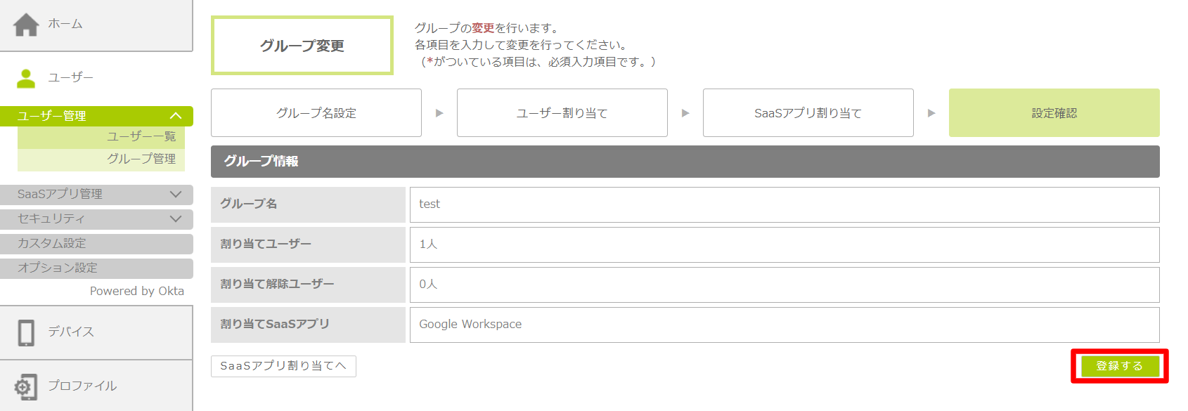 「グループ情報」の「割り当てSaaSアプリ」前画面にて設定したSaaSアプリ名が表示されているのを確認します。