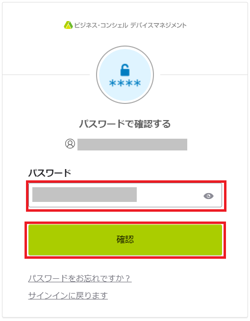 2.「パスワードで確認する」画面が表示された場合は、BCDM管理画面で用いるパスワードを入力し、「確認」ボタンをクリックします。