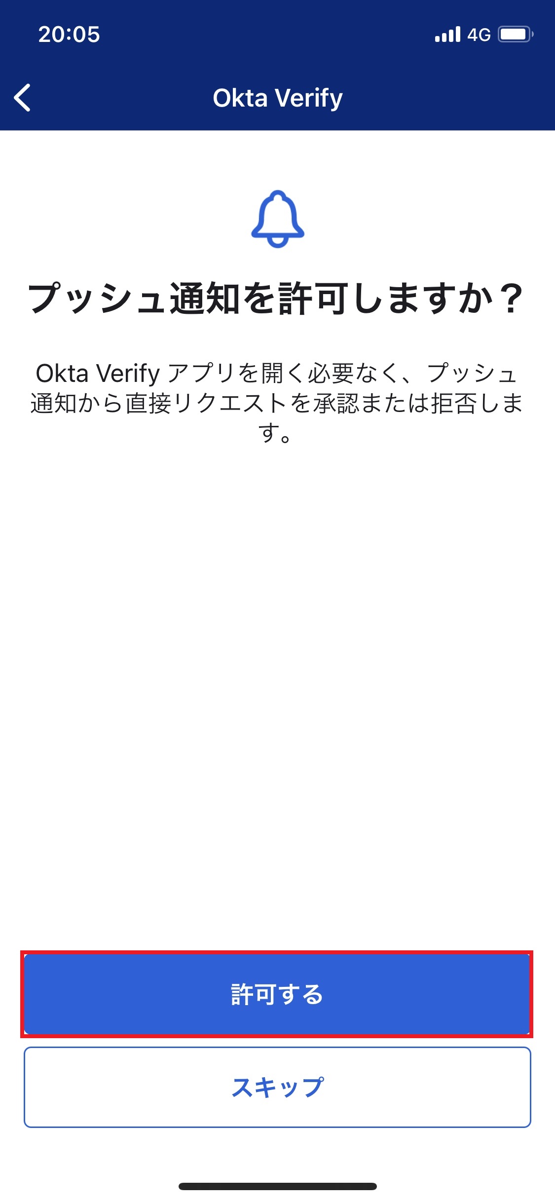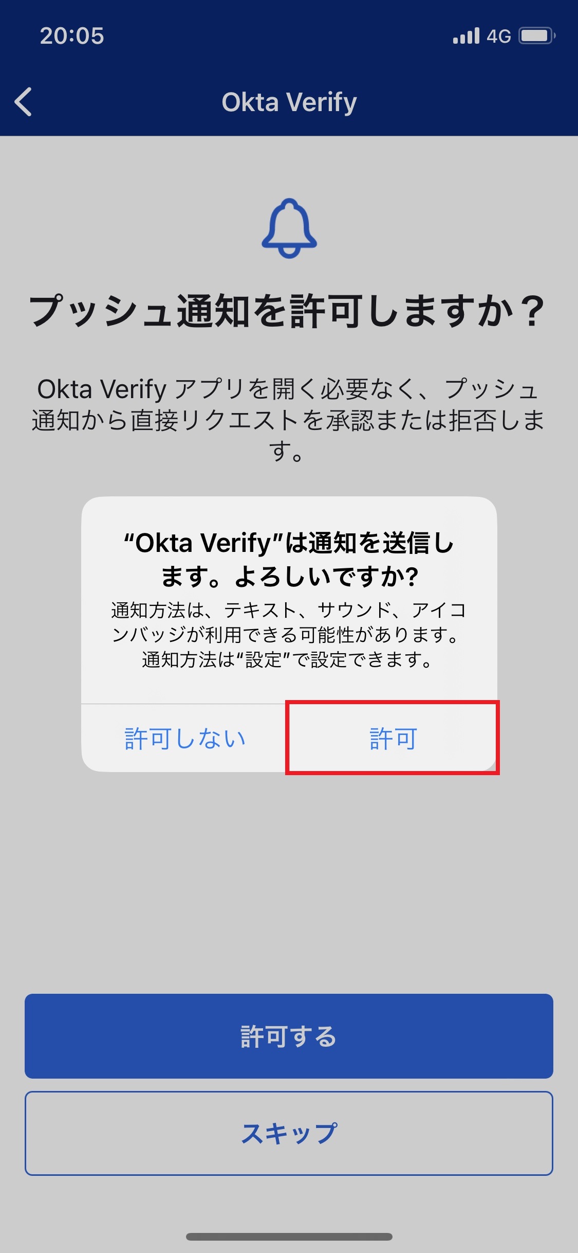17.「”Okta Verify”は通知を送信します。よろしいですか?」画面で「許可」をタップします。