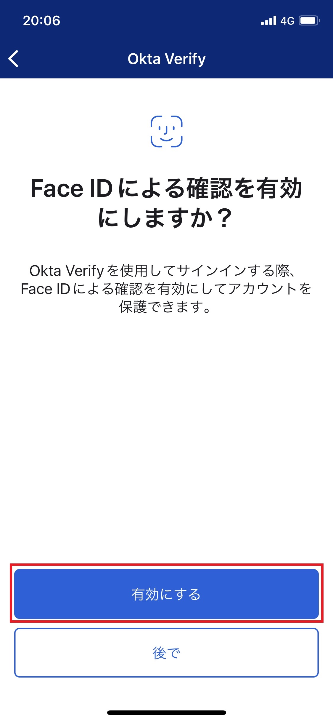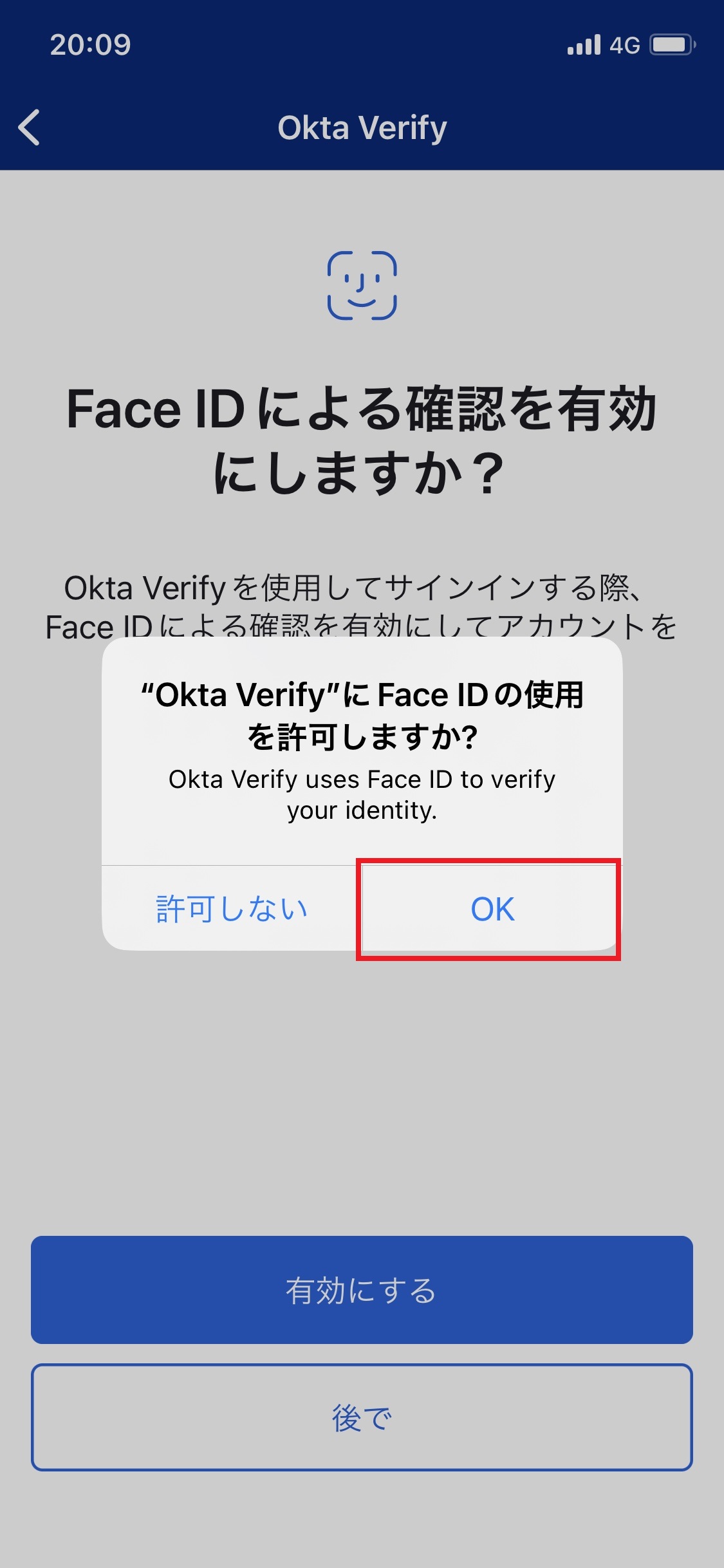 19.「”Okta Verify”にFace IDの使用を許可しますか?」画面で「OK」をタップします。