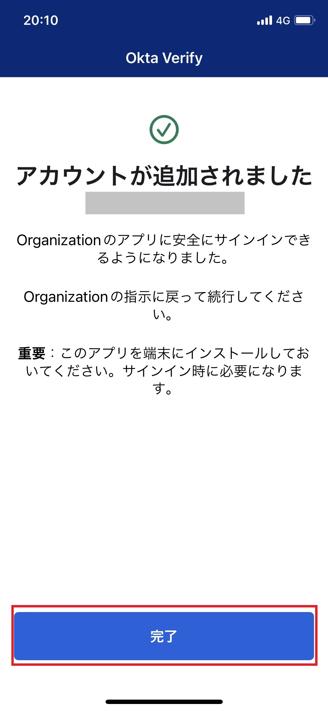 20.「アカウントが追加されました」画面で「完了」をタップします。