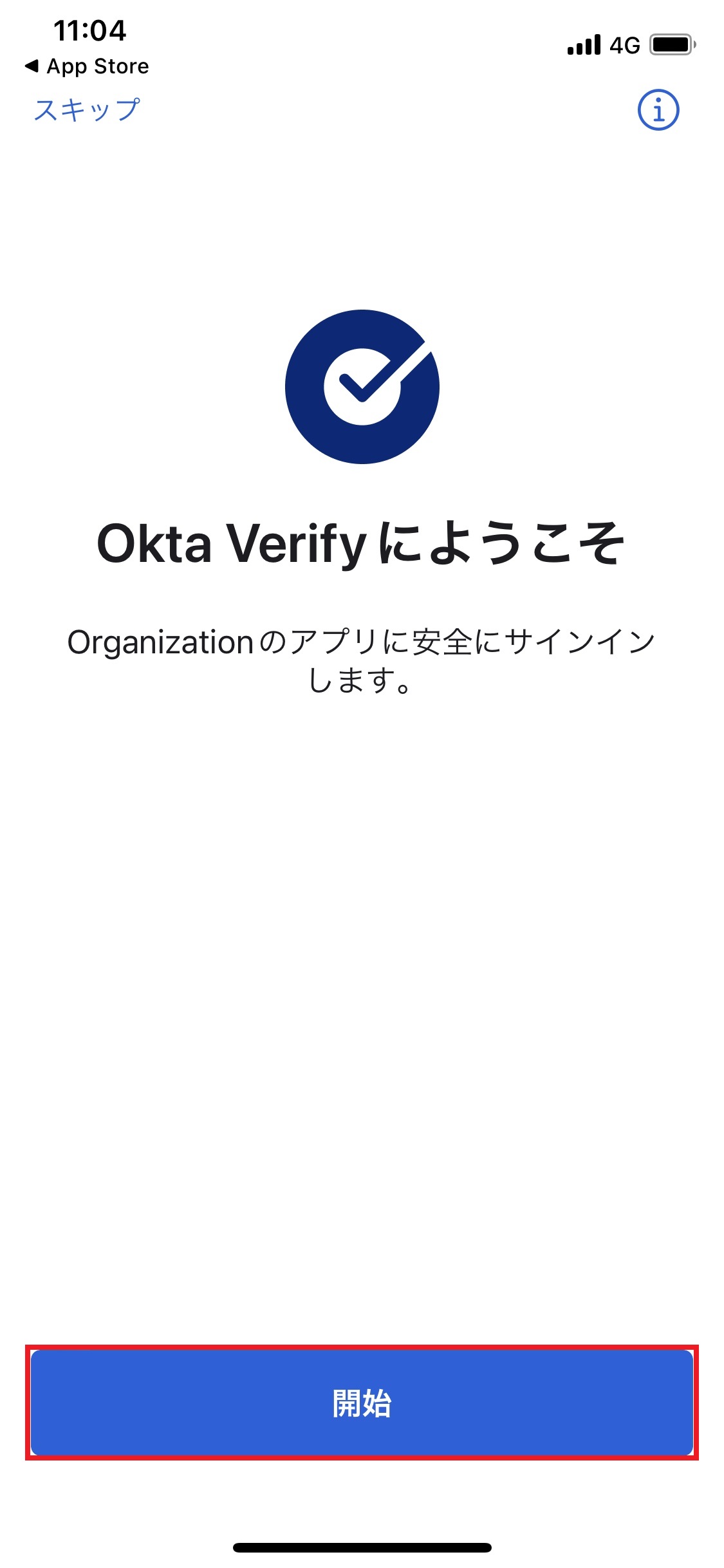 8.「Okta Verifyにようこそ」画面で「開始」をタップします。