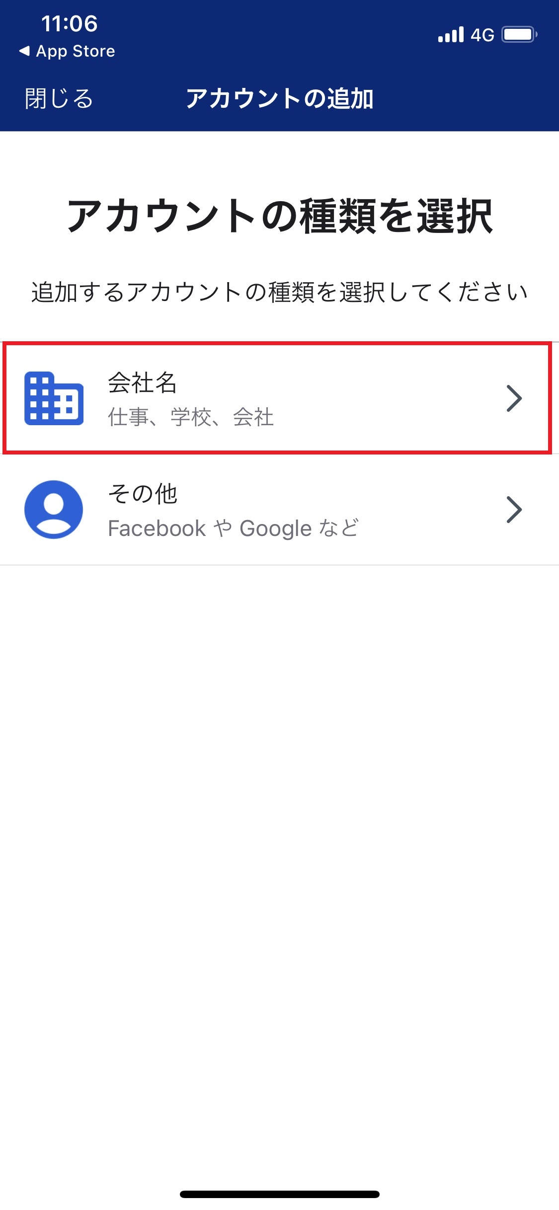 11.「アカウントの種類を選択」画面の「会社名」をタップします。