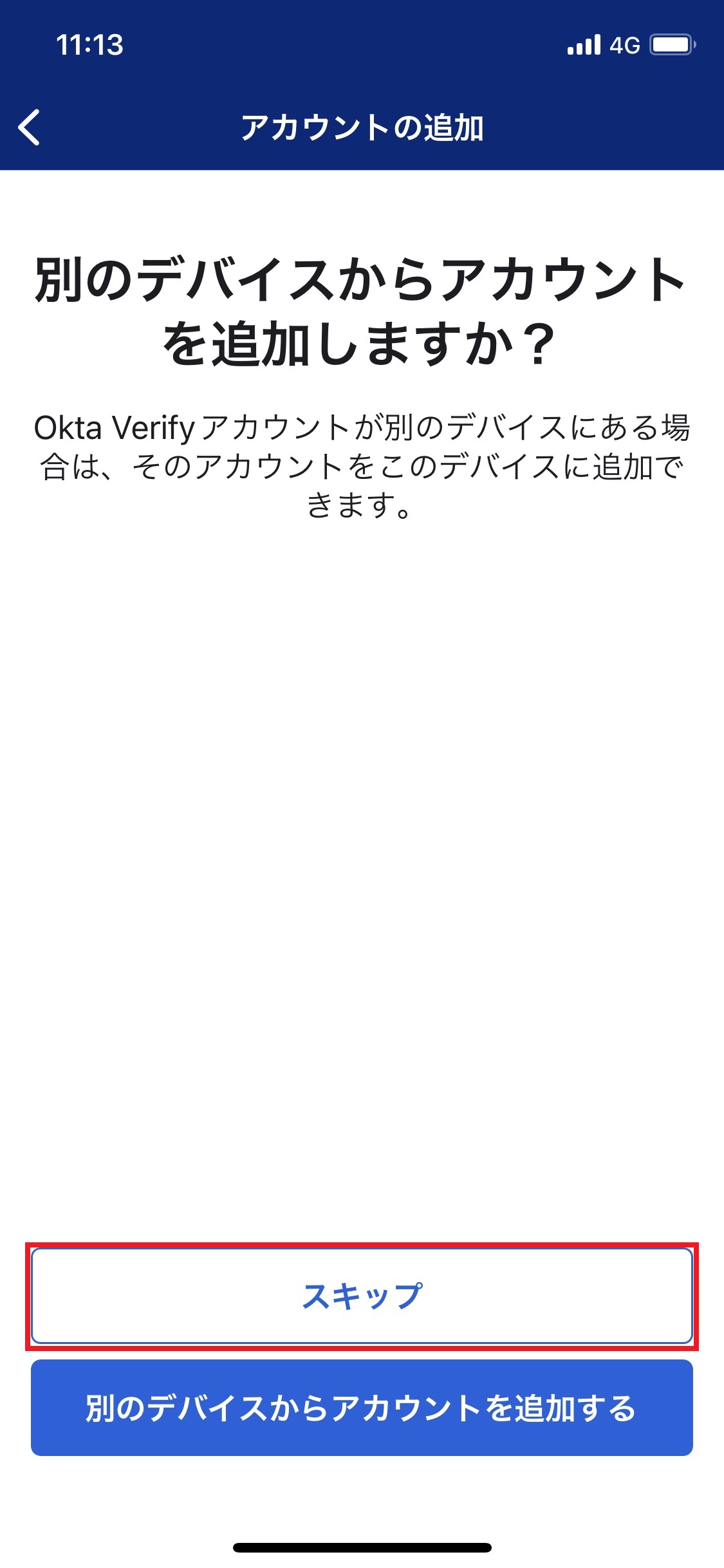 12.「別のデバイスからアカウントを追加しますか?」画面の「スキップ」をタップします。