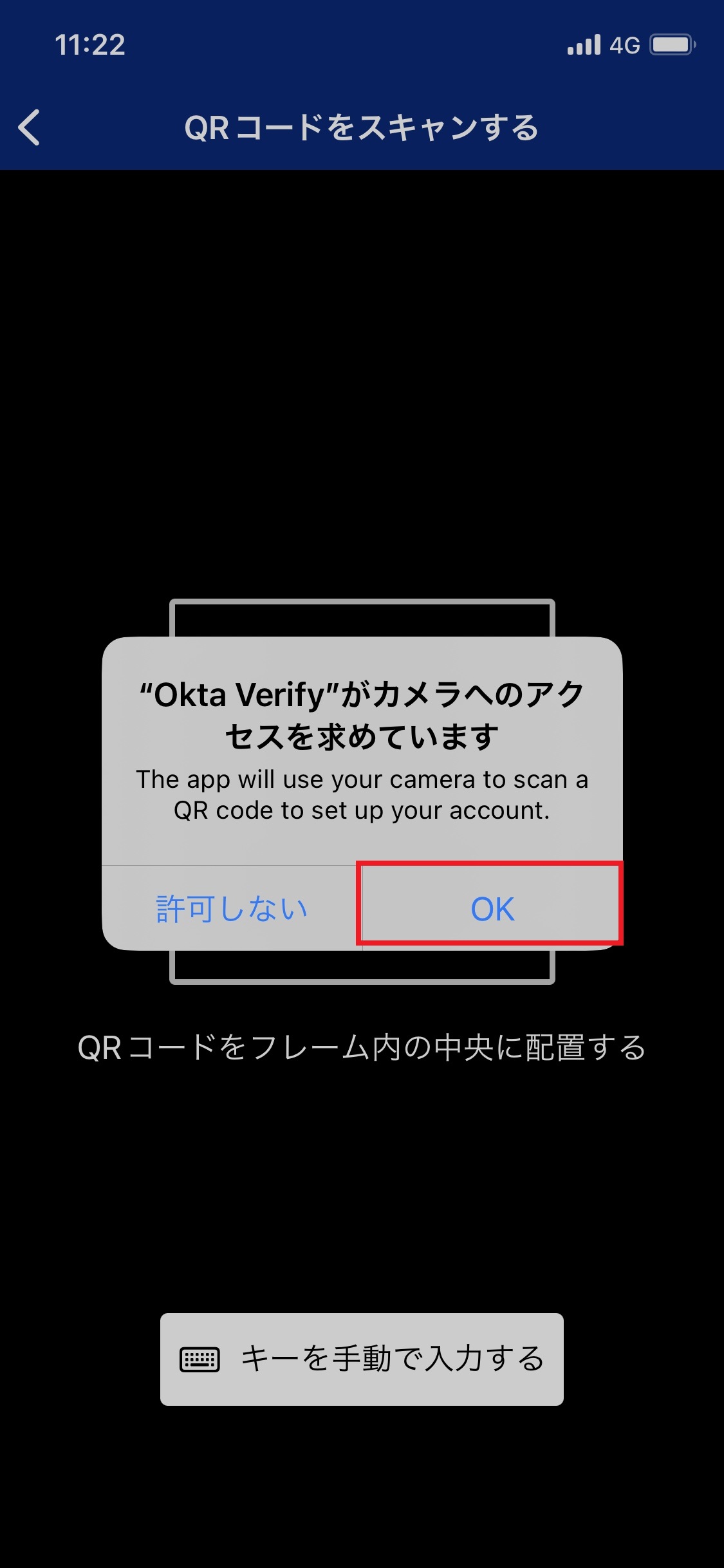 14.「QRコードをスキャンする」画面で、「”Okta Verify”がカメラへのアクセスを求めています」画面が表示されたら、「OK」をタップします。