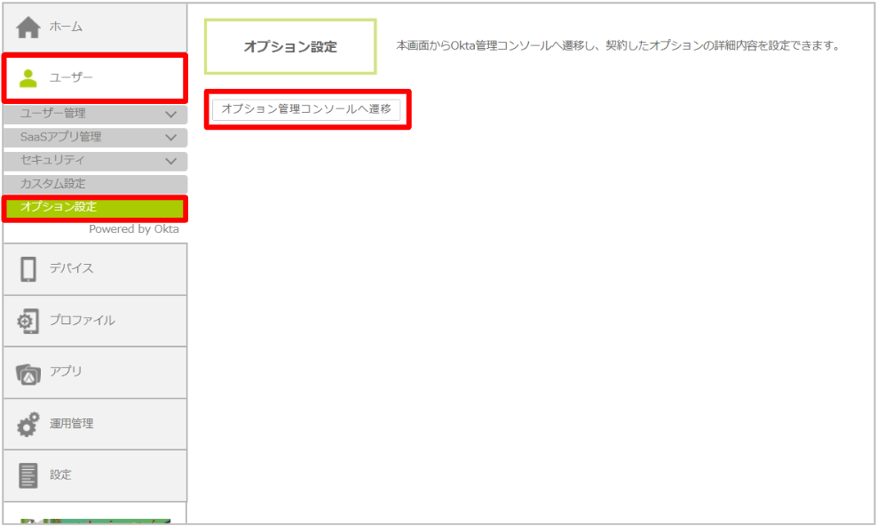 • 「ユーザー」-「オプション設定」-「オプション管理コンソールへ遷移」をクリック