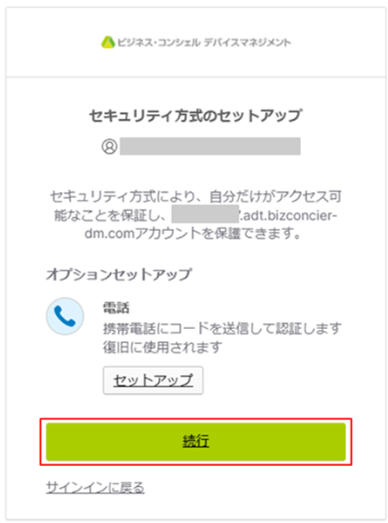 21.「セキュリティ方式のセットアップ」画面で「続行」ボタンをクリックします。