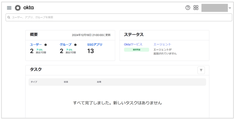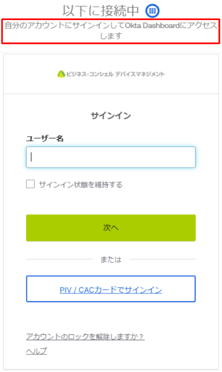 ダッシュボード(Okta Dashboard)のサインイン/サインアウト状況により、「自分のアカウントにサインインして​Okta Dashboardに​アクセスします」の画面が表示されることがございます。