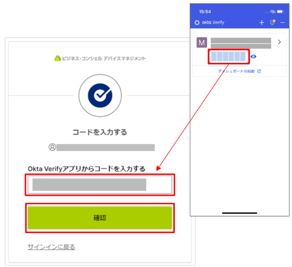 3.「コードを入力する」画面で「Okta Verify」アプリの6桁のワンタイムパスワードを入力し、「確認」ボタンをクリックします。