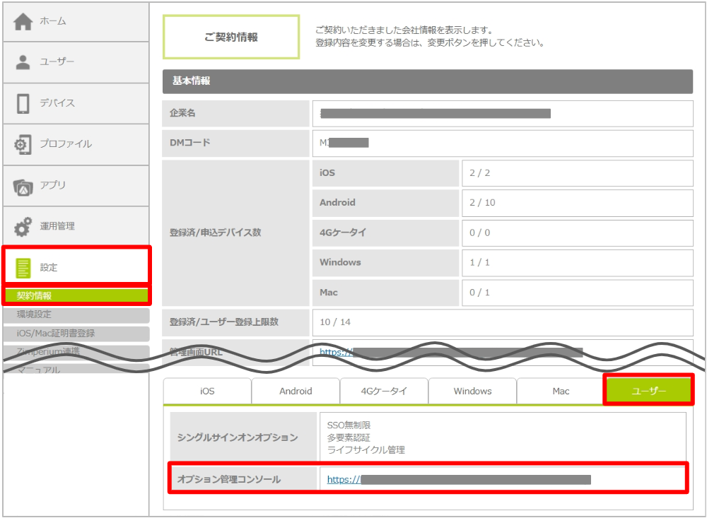 • 「設定」-「契約情報」-「ユーザー(タブ)」-「オプション管理コンソール」のリンクをクリック